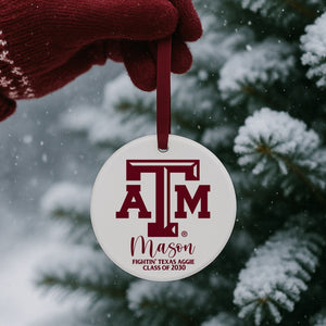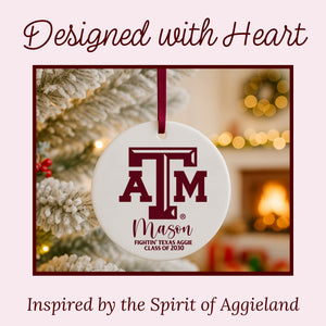 Celebrate the Aggie Spirit with a personalized Texas A&M ornament that honors every milestone — first Christmas on campus, graduation year, Aggie Mom pride, alumni memories, or gifting someone joining the Aggie family. With your custom name and class year, each ornament becomes a keepsake they’ll treasure every season.