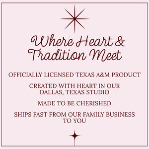 Crafted in our Aggie alumni (Class of 2012!) family-run studio in Garland, TX with professional equipment and boutique-quality craftsmanship.